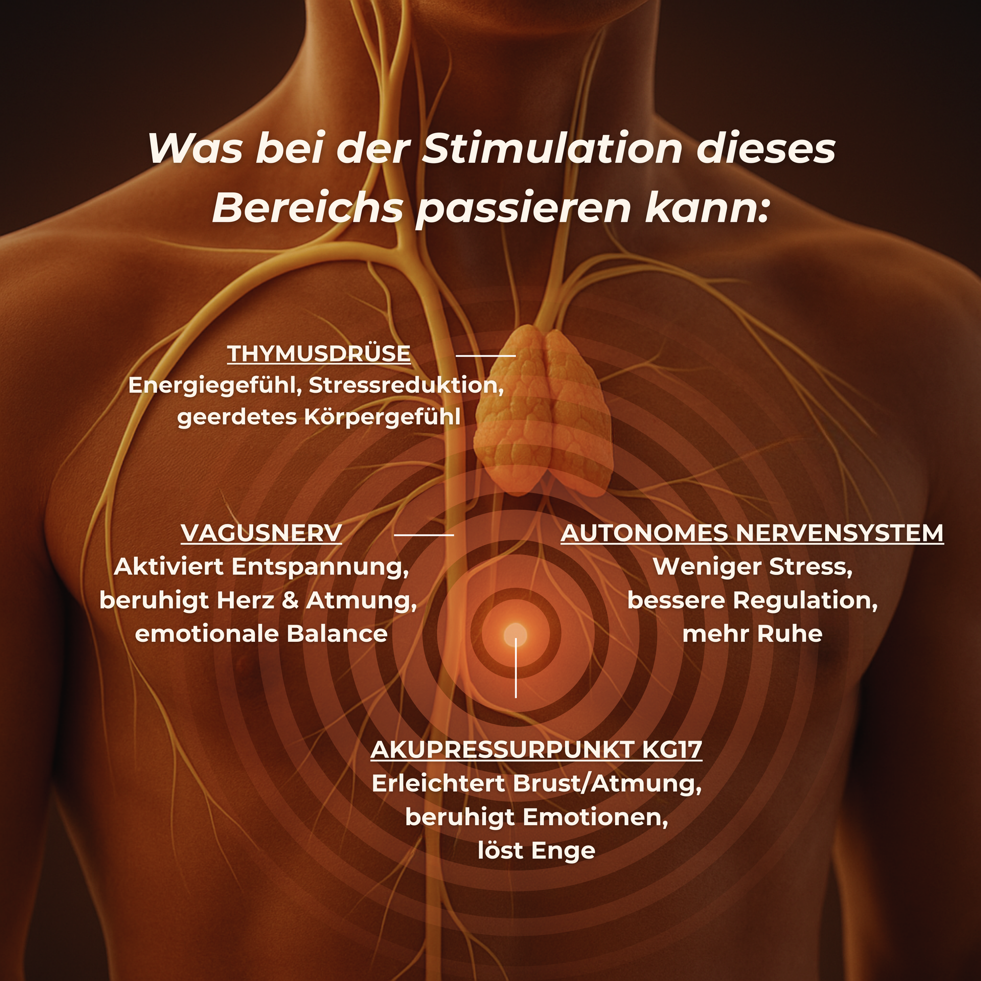 Die Stimulation des Akupressurpunkts KG 17 aktiviert den Bereich rund um die Thymusdrüse und setzt sanfte Impulse, die über den Vagusnerv das Gefühl von Balance und innerer Stabilität fördern.