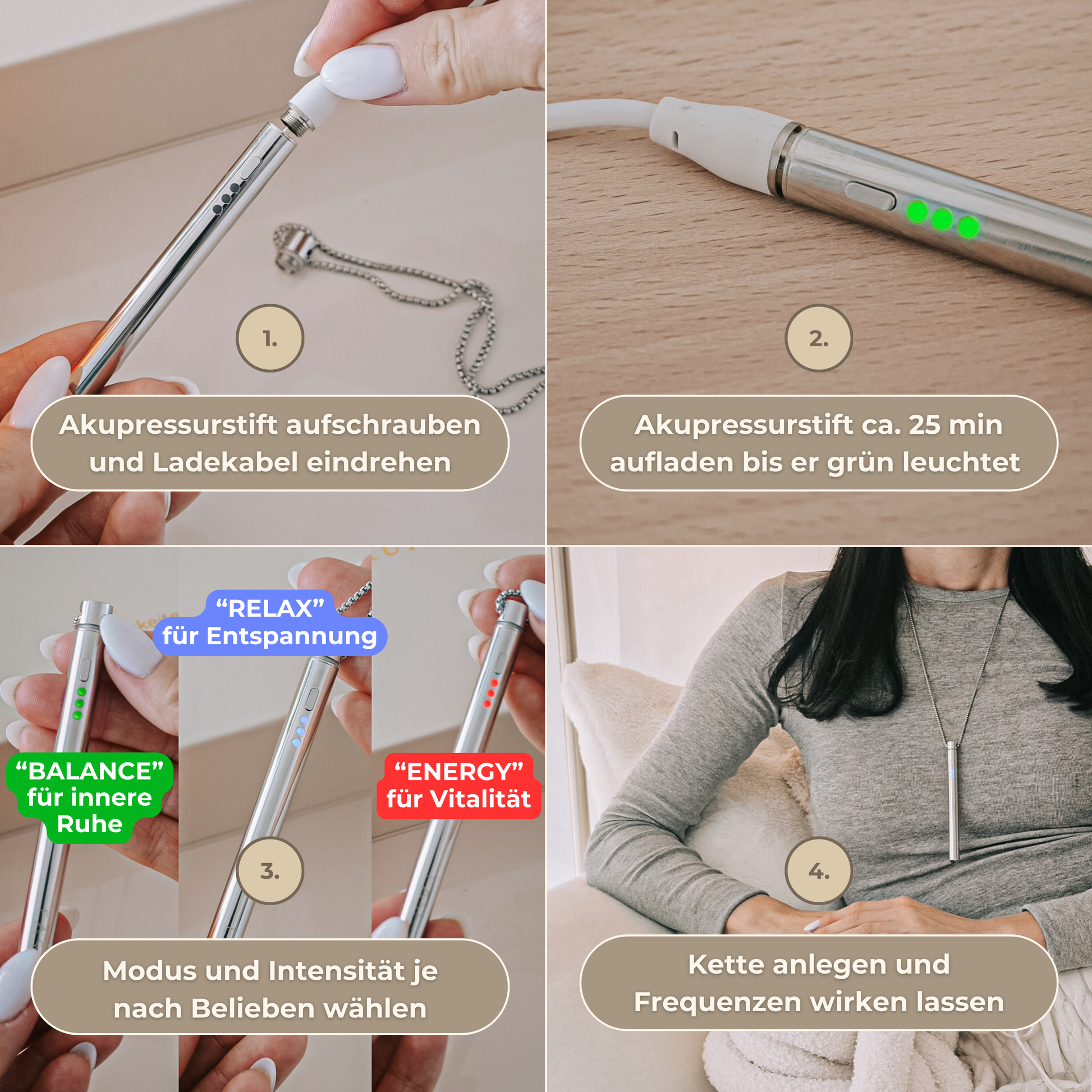 Jeder Modus verfügt über drei Intensitätsstufen, die du durch mehrfaches Drücken des Auswahlknopfes einstellen kannst. Zum Beispiel zeigt ein grünes Licht sanfte Harmonisierung an, zwei blaue Punkte zum Beispiel eine mittlere Entspannung, und drei rote Punkte beispielsweise intensive Vitalität.